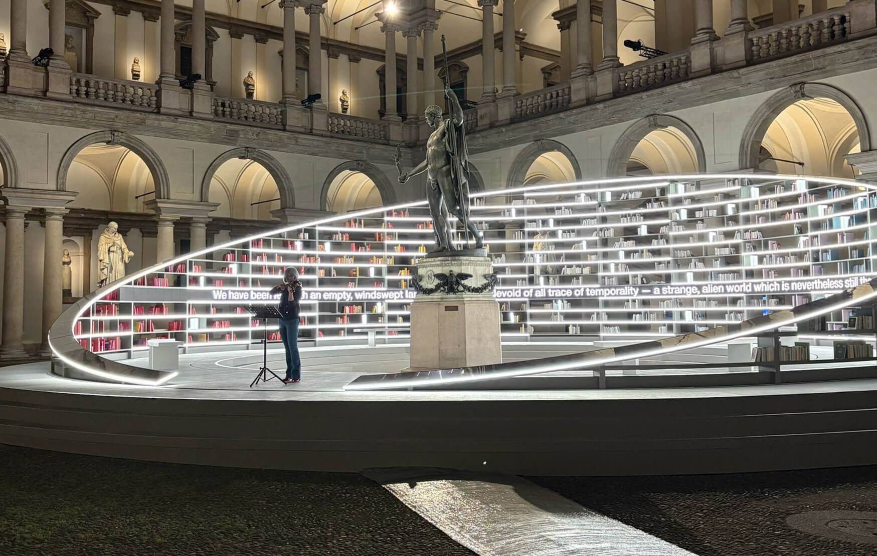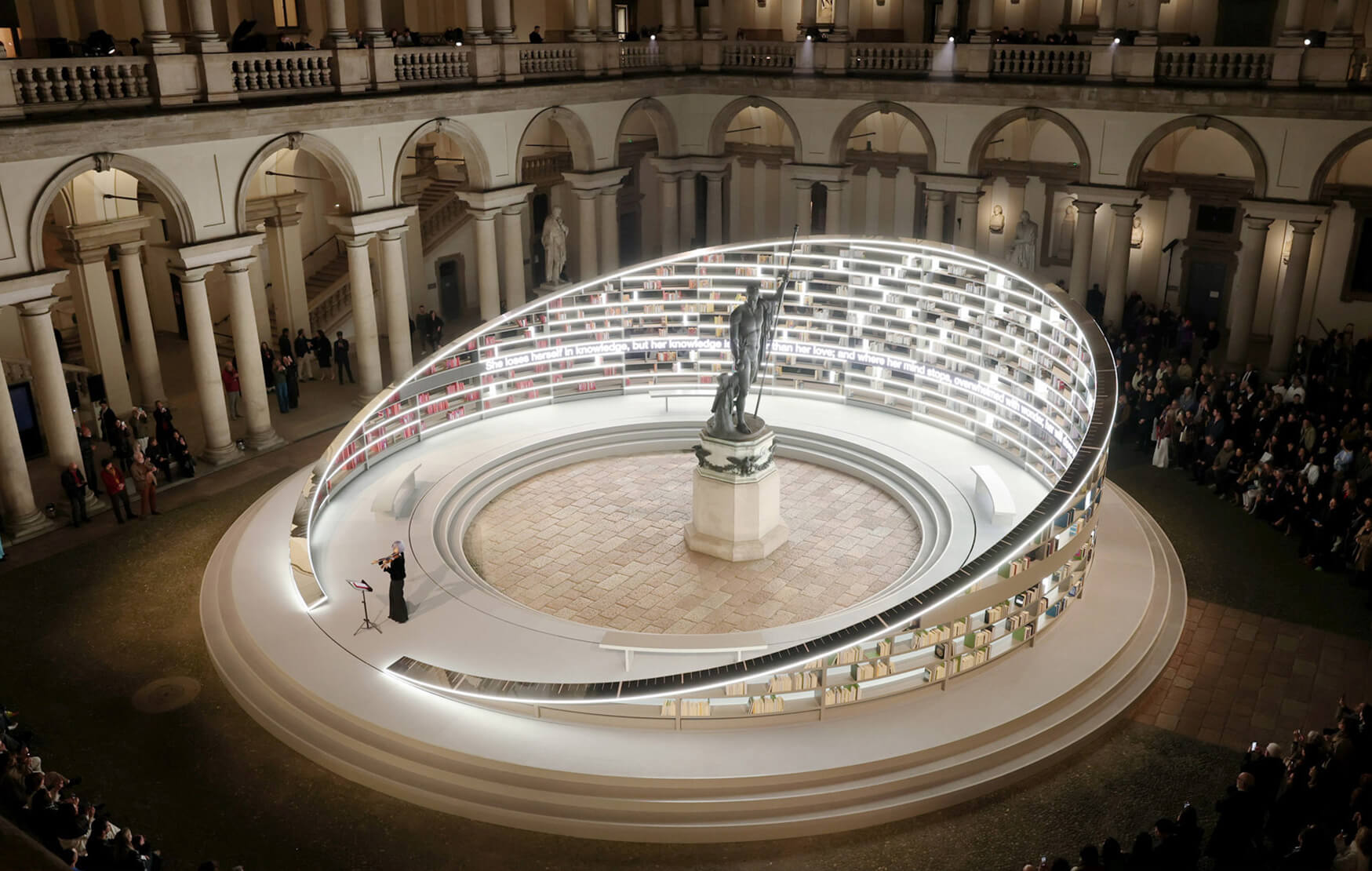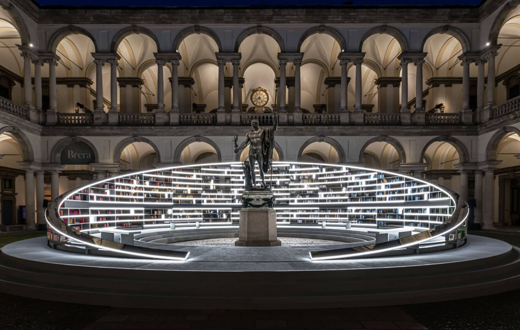 Library of light trova spazio al centro del Cortile d'Onore del XVII secolo, che collega la Pinacoteca di Brera, la Biblioteca Nazionale Braidense e l'Accademia di Belle Arti. É una straordinaria scultura, un "Faro di Sapere" dalla forma circolare (diametro di 18m), formata da scaffali luminosi contenenti oltre 2000 volumi.